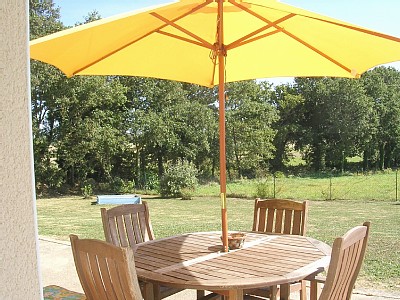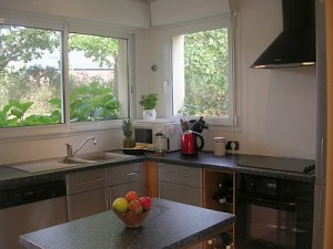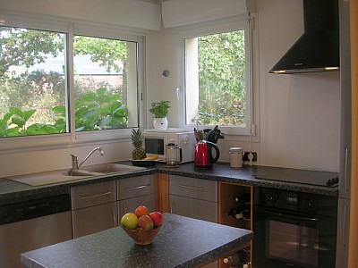 Kerberry is an eco friendly detached house with large open plan living room and mezzanine floor above, picture windows and sliding doors opening onto the patio. The design of which makes it extremely light and spacious. English and French freeview television and DVD. Dining room with seating for six people.